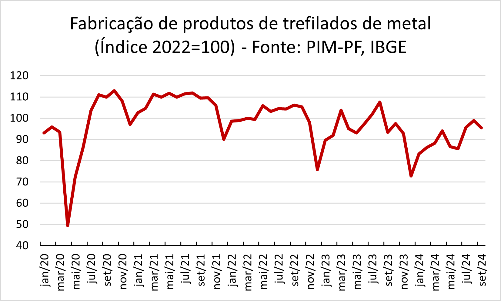 As dificuldades enfrentadas pelo setor de trefilados perduram há longo prazo, com o pico da série histórica do IBGE registrado em julho de 2008, período que imediatamente antecedeu a crise econômica agravada pela quebra do banco Lehman Brothers. Naquela ocasião, o índice alcançou 150,2 pontos, considerando uma base em que a média de 2022 equivale a 100. Em julho de 2024, o índice caiu para 95,62 pontos, um nível 36,3% abaixo do valor máximo atingido.