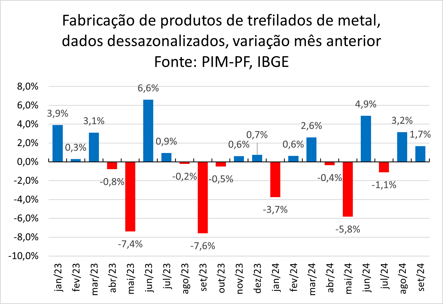 O IBGE não divulga dados dessazonalizados para os trefilados de metal, úteis para comparações mensais. Ao se dessazonalizar a série histórica, verifica-se que o setor de trefilados apresentou crescimento de 1,7% em setembro, frente a agosto. Trata-se do segundo mês seguido de crescimento, mas insuficiente para reverter o resultado negativo ao longo do ano.
