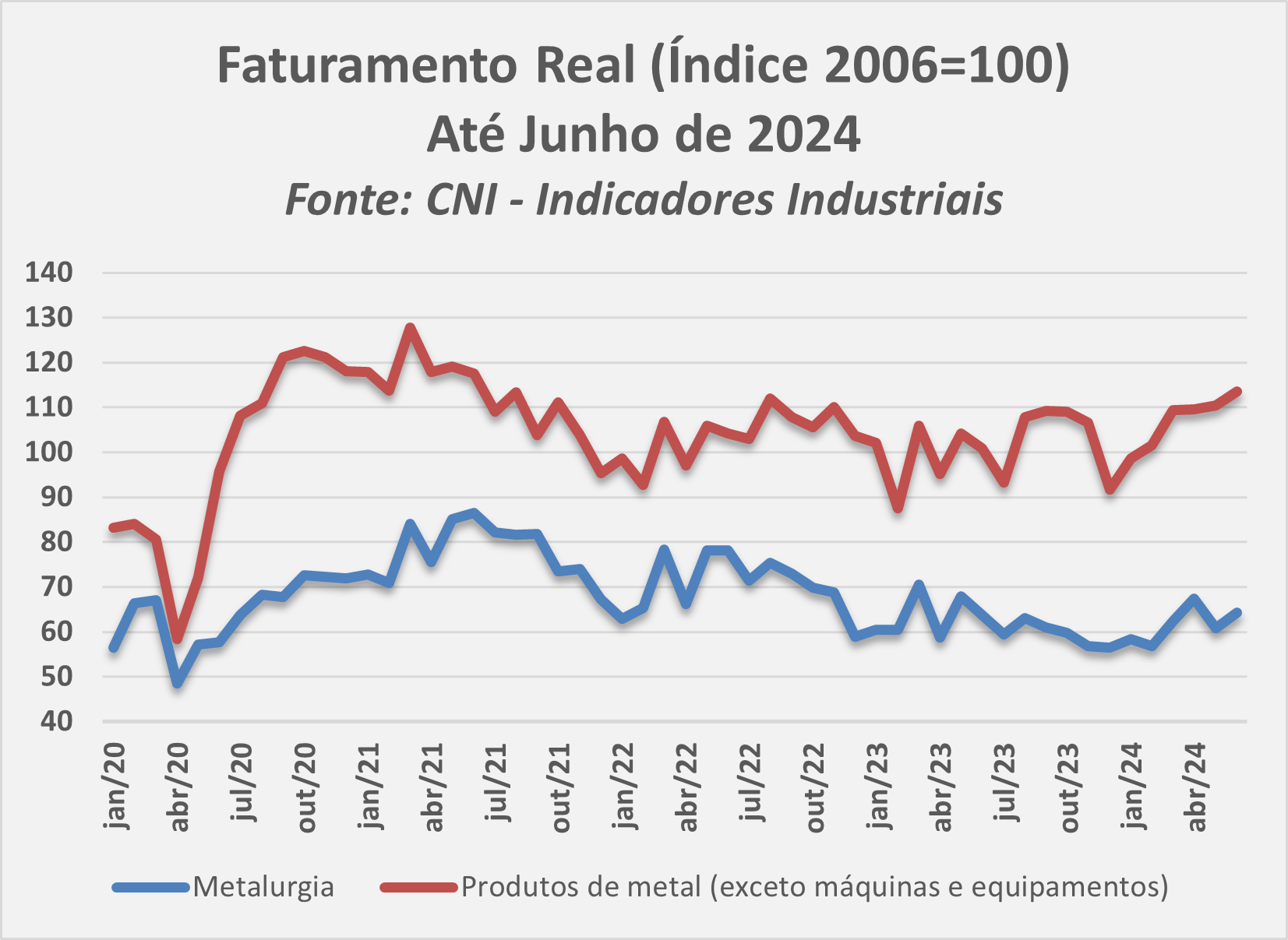 O faturamento real dos setores processadores de aço em junho também foi positivo. A metalurgia cresceu 0,7% em junho de 2024 na comparação com o mesmo mês de 2023, enquanto essa variação foi de 12,5% para os produtos de metal. A CNI não divulga índices dessazonalizados para estes dois grupos. Entretanto, ao aplicarmos os fatores sazonais da indústria de transformação para esses dois setores, houve crescimento de 5,1% para a metalurgia e de 2,1% dos produtos de metal em junho de 2024 na comparação o mês anterior.