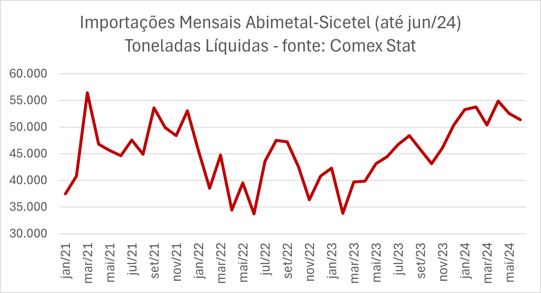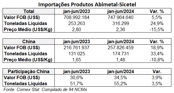 O ano de 2024 ainda é marcado por forte aumento de produtos processados de aço. No acumulado de janeiro a junho de 2024, as importações totais subiram para 316.299 toneladas, um salto de 24,9% em relação ao primeiro semestre do ano passado (253.263 toneladas). Em termos de valor FOB, as importações totalizaram US$747,96 milhões, alta de 5,5%. As importações da China se aceleraram mais que o total, totalizando 174.731 toneladas, um crescimento de 33,4% nesta base de comparação. O valor FOB dos produtos oriundos do país asiático cresceu 18,9%, atingindo US$257,83 milhões.