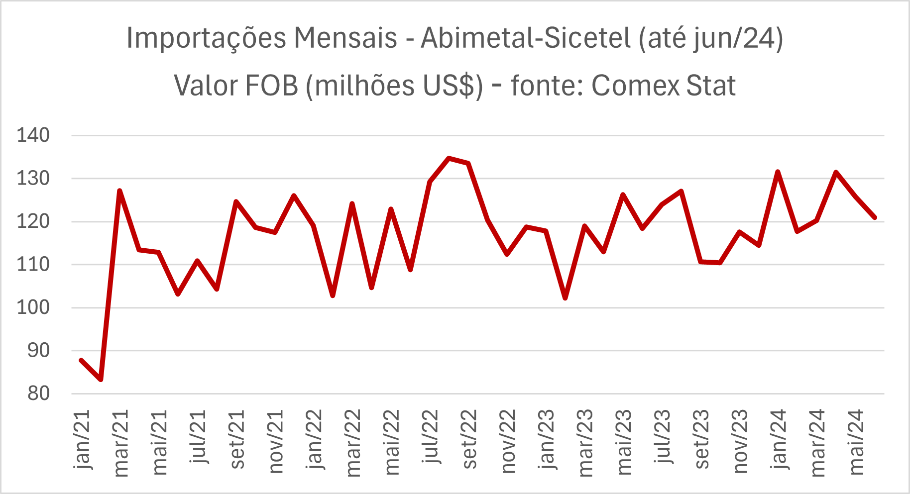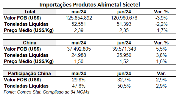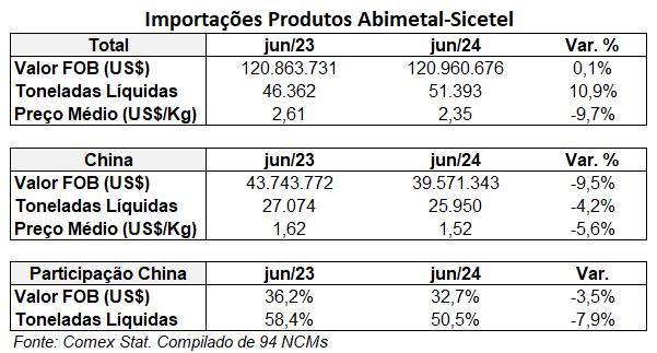 Na comparação com junho de 2023, o volume importado em junho de 2024 cresceu 10,9%, ao passo que o valor FOB cresceu somente 0,1%. As importações chinesas caíram 4,2% e 9,5% em volume e valor FOB (US$), respectivamente.