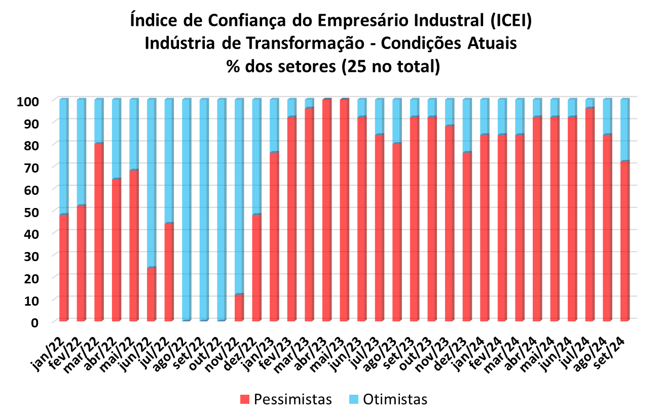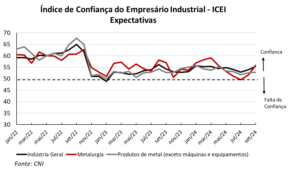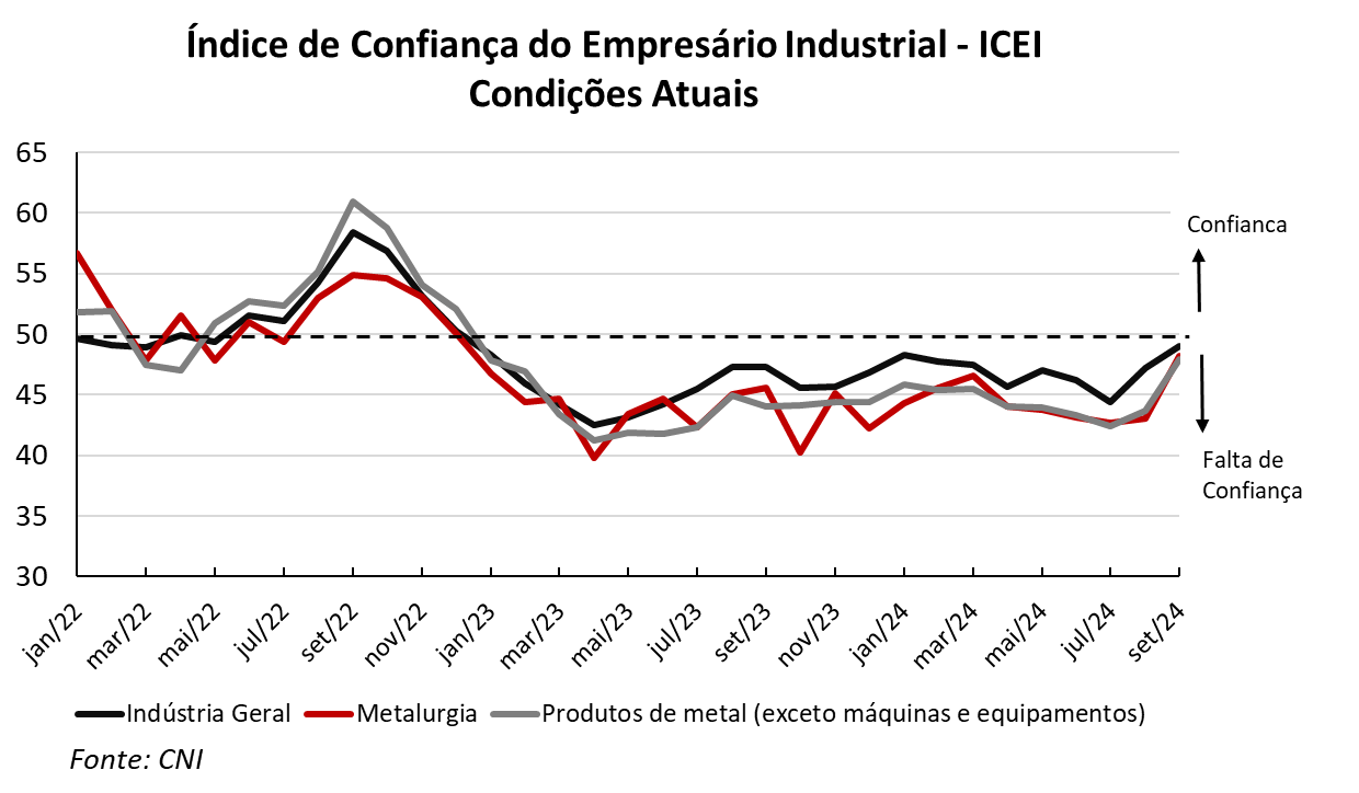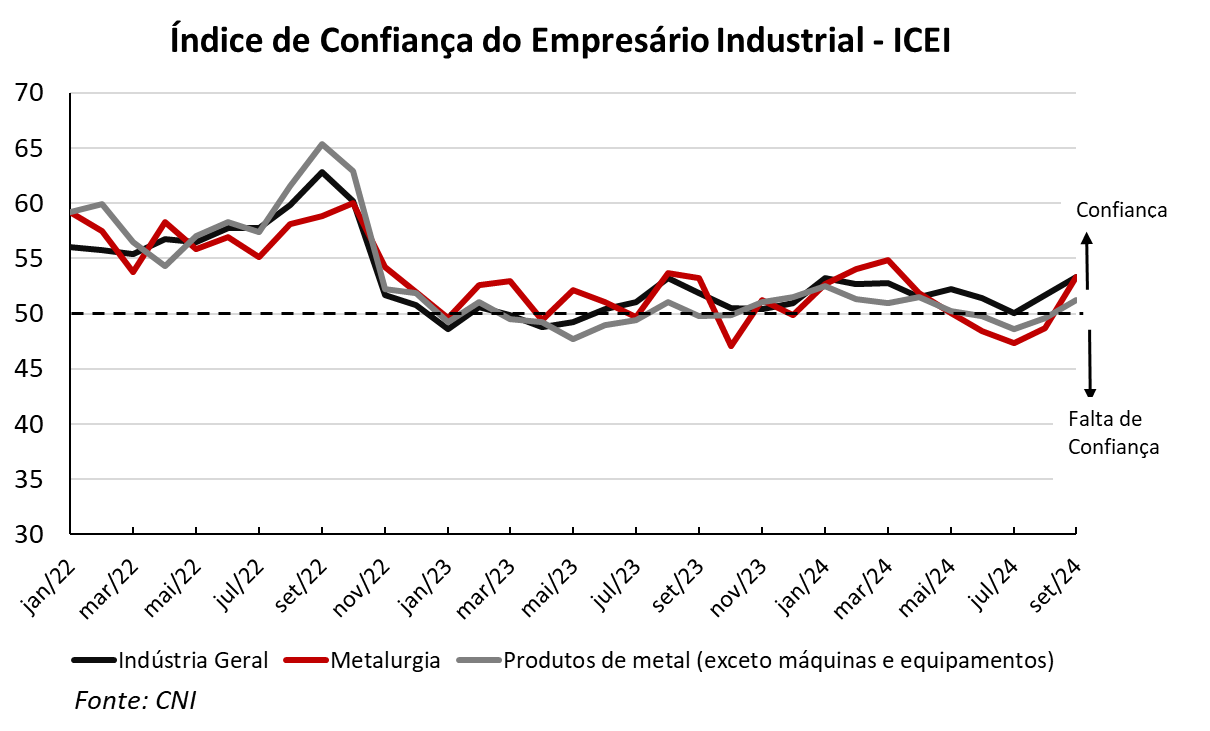 O Índice de Confiança do Empresário Industrial (ICEI), elaborado pela Confederação Nacional das Indústrias (CNI) apresentou resultados positivos em setembro de 2024 para a indústria, com avanço em 21 das 29 categorias, queda em sete e estabilidade em um setor. As indústrias processadoras de metal defendidas pela Abimetal-Sicetel, inseridas na metalurgia e produtos de metal (exceto máquinas e equipamentos) estão inclusas no grupo com avanço. Os índices são construídos de forma que valores superiores a 50 indicam otimismo e abaixo deste patamar, pessimismo. O índice se divide, por sua vez, em dois componentes: condições atuais e expectativas.