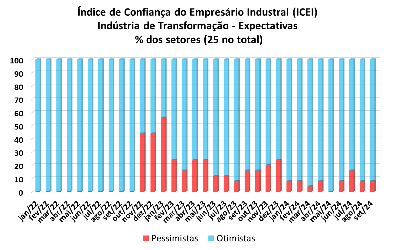 Analisando-se as categorias da indústria de transformação, 19 dos 25 setores apresentaram aumentos nos índices para agosto, sendo que 23 se encontram em campo otimista. Em agosto, 18 setores estavam otimistas.