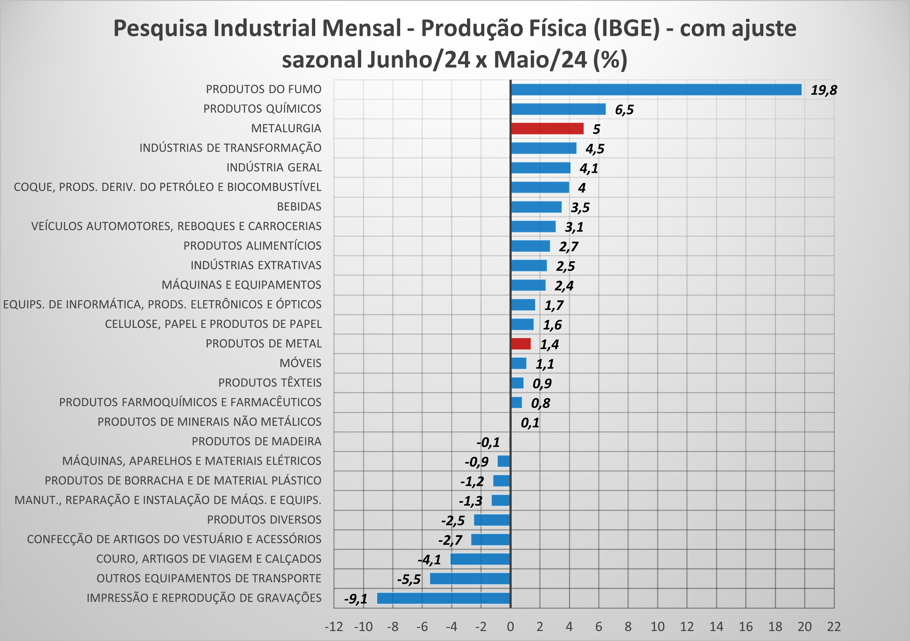 Para os dois setores em que se incluem as atividades processadoras de aço, a metalurgia e a fabricação de produtos de metal (exceto máquinas e equipamentos), o mês de junho apresentou, respectivamente, crescimento de 5% e 1,4% na comparação com maio (série dessazonalizada). Ambos os setores vinham de quedas em maio. Com os resultados de junho, estes setores voltam a patamares superiores aos de abril, indicando recuperação após as enchentes do Rio Grande do Sul em maio.