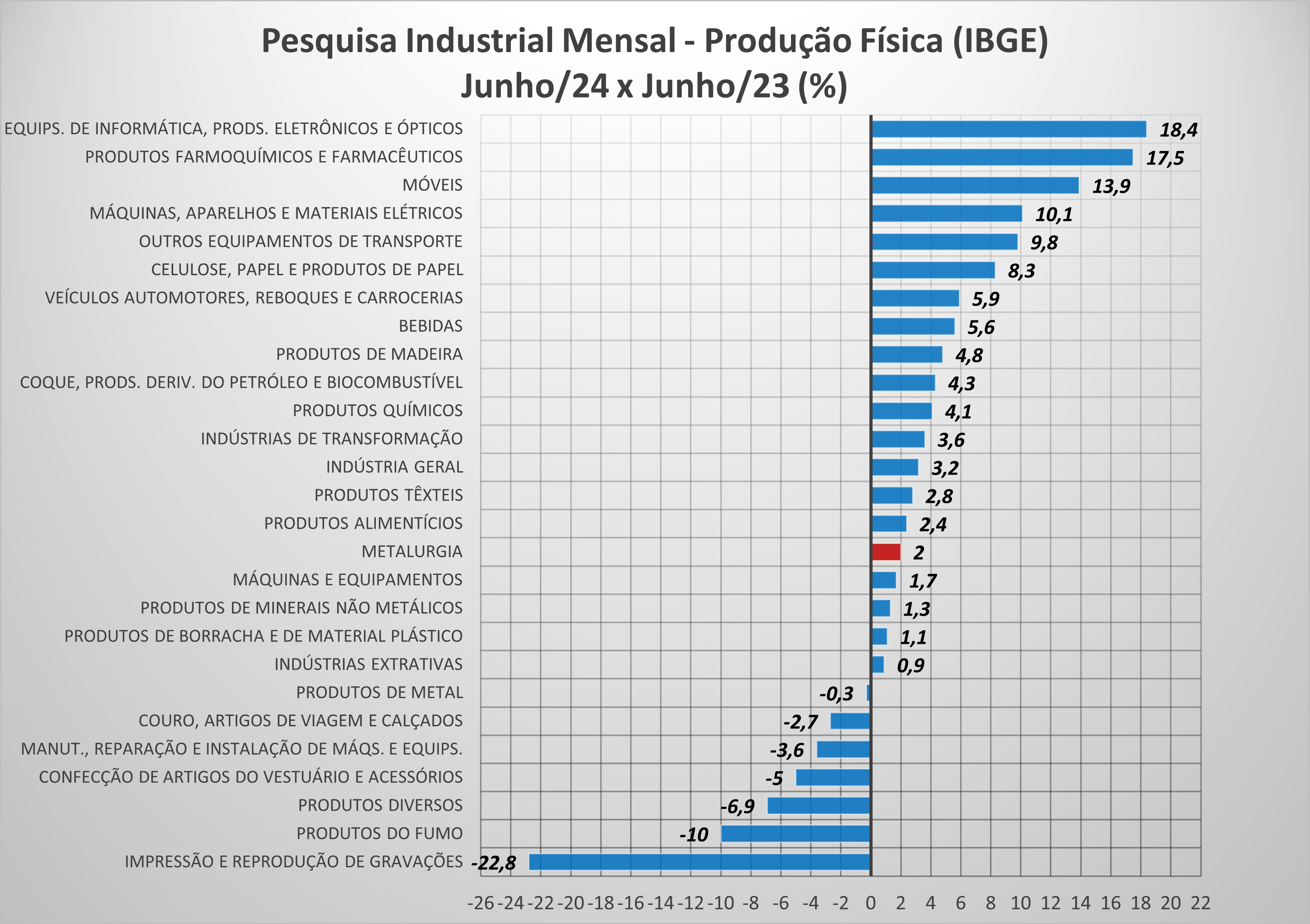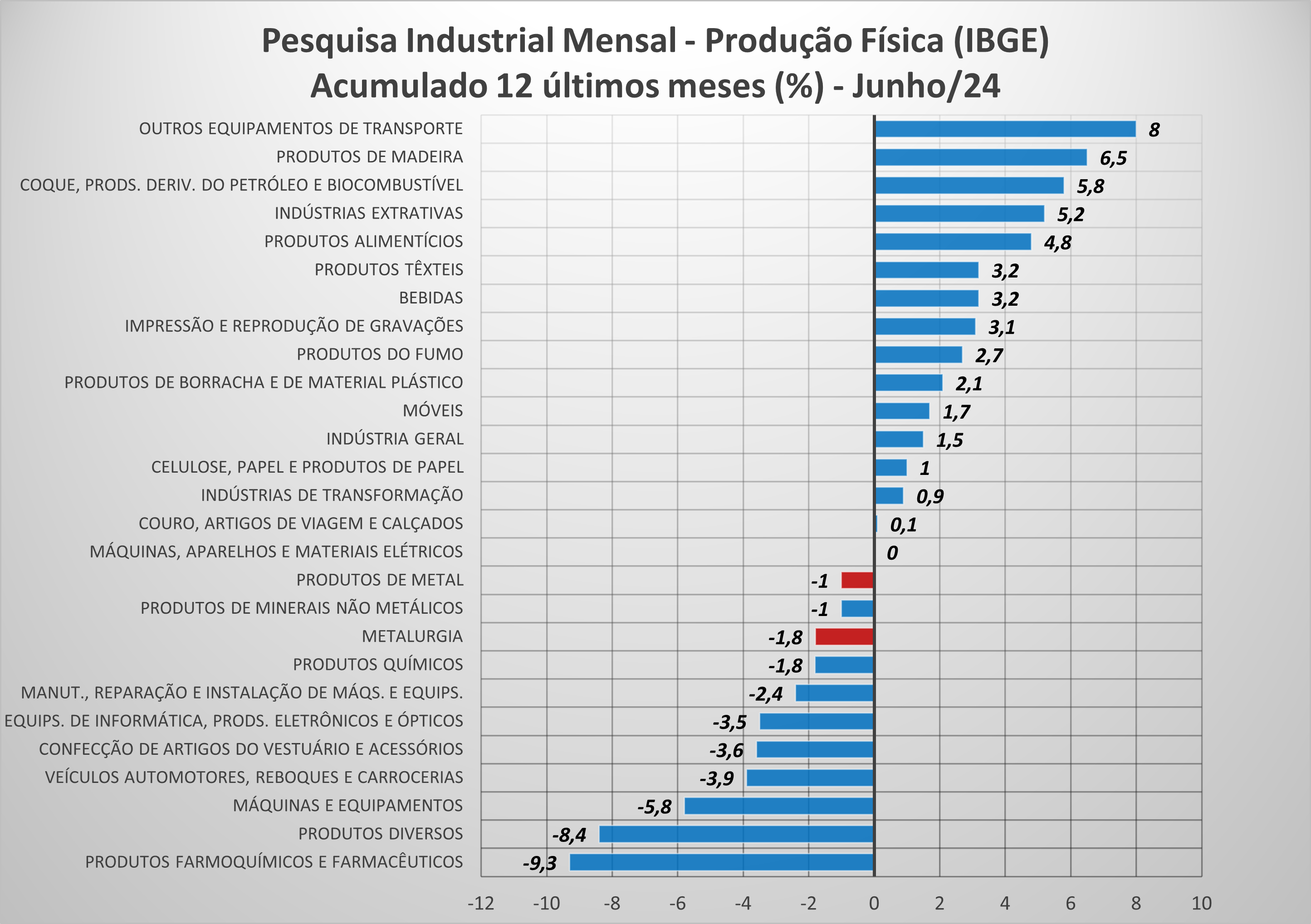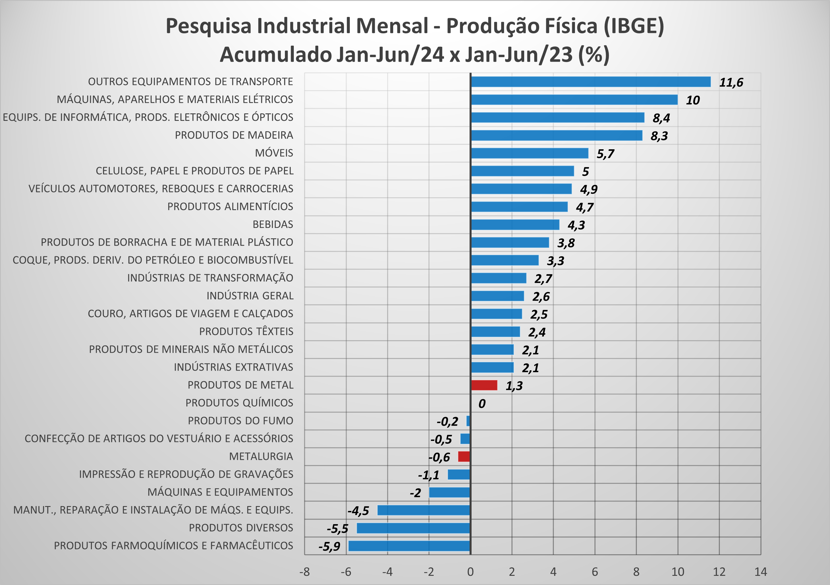 O índice de produção da metalurgia em junho de 2024 foi 2% superior ao mesmo mês de 2023, mas, no acumulado do primeiro semestre deste ano frente ao mesmo período do ano passado o setor ainda recua 0,6%. No acumulado de 12 meses, o recuo é superior: -1,8%. Para os produtos de metal, essas variações foram -0,3%, 1,3% e -1%, respectivamente.