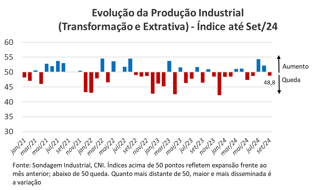 O índice de evolução da produção industrial (indústria de transformação e extrativa) recuou para 48,8 pontos em setembro, território de retração. Os índices usados para mensurar o desempenho são construídos de maneira que valores acima de 50 pontos indicam aumento em relação ao mês anterior, valores abaixo de 50 indicam retração. Quanto mais distante de 50, mais intensa é a variação do indicador. Esta queda na produção veio após dois meses seguidos de crescimento.