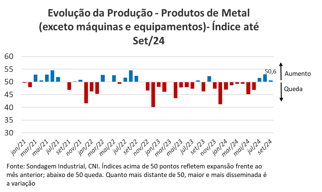 Publicado em 05/11/2024Os resultados da pesquisa Sondagem Industrial da Confederação Nacional das Indústrias (CNI) para setembro de 2024 apontam recuo da produção da indústria geral (transformação e extrativa) em setembro frente a agosto, de forma disseminada, inclusive com queda na metalurgia. O setor de produtos de metal (exceto máquinas e equipamentos), por sua vez, apresentou leve crescimento no período.