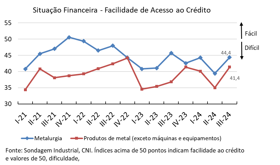Sobre a facilidade de acesso ao crédito (indicador trimestral), houve melhora no terceiro trimestre, com a metalurgia registrando 44,4 pontos e os produtos de metal 41,4, contra 39,4 e 35 no segundo trimestre, respectivamente. Apesar da melhora dos indicadores, estes ainda se encontram abaixo dos 50 pontos, refletindo a dificuldade de acesso ao crédito.